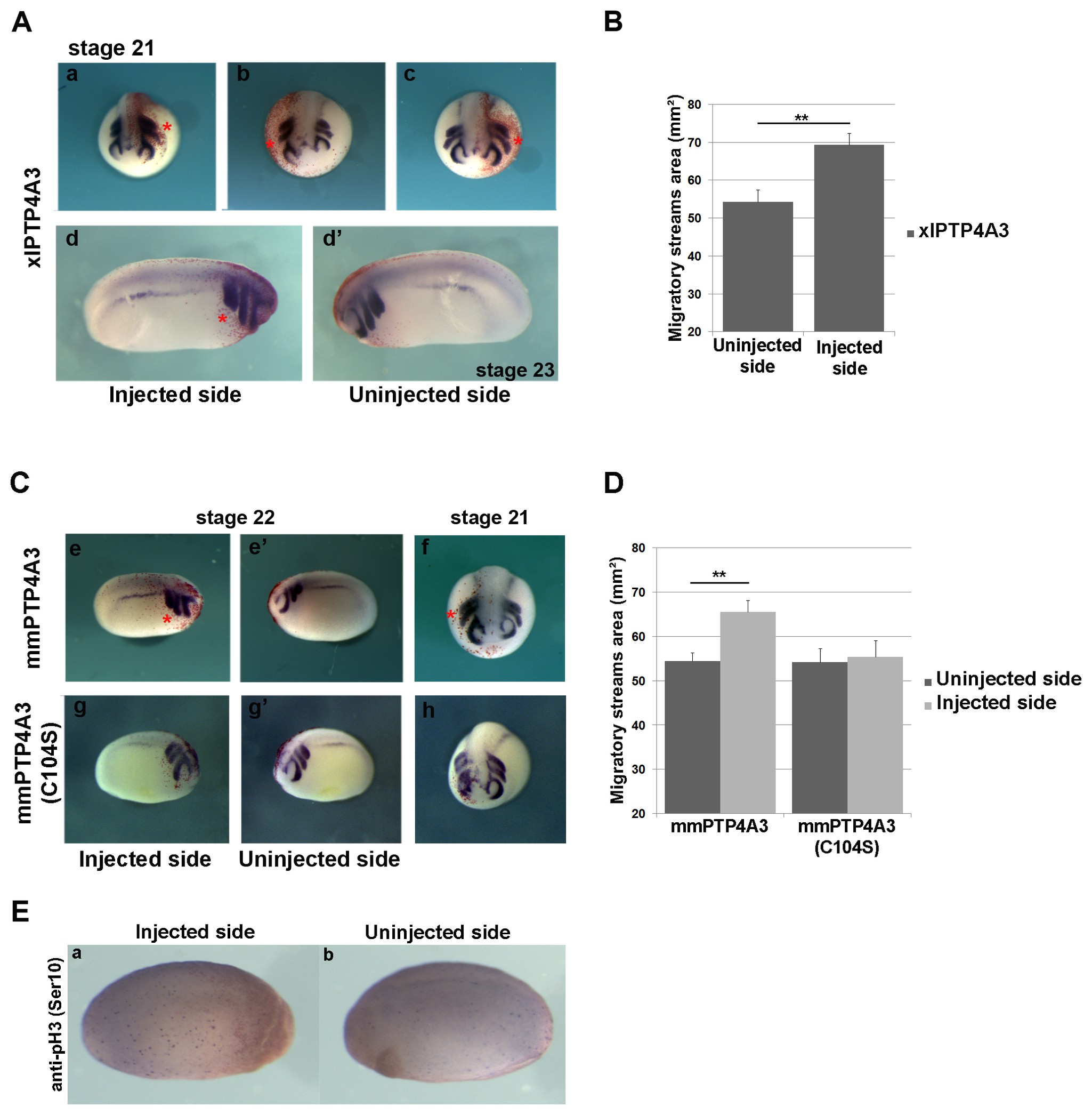 xlPTP4A3, mmPTP4A3 or the mutant form mmPTP4A3(C104S) were injected at the four-cell stage in the animal pole region, and embryos were cultured until stage 22. A) Overexpression of xlPTP4A3 induces a strengthening (b, d vs. d') and/or lengthening (a, c) of the anterior NC migration streams as showed by whole-mount in situ hybridization on xlTWIST. B) xlPTP4A3 corresponding phenotype quantification was determined as the area of the NC migratory streams showing that the migratory streams surface is greater in the injected side than in the uninjected side (n=15) (**p<0,01). C) Overexpression of mmPTP4A3 causes a strengthening and/or lengthening (e vs.e', f) of the anterior NC migration streams while overexpression the mutant form mmPTP4A3(C104S) does not seem to significantly affect the migration of the NC (g vs.g', h). D) mmPTP4A3 or mmPTP4A3(C104S) corresponding phenotype quantification was determined as the area of the NC migratory streams showing that mmPTP4A3 injected embryos display a greater anterior NC area in the injected side than in the uninjected side while no difference in the anterior NC area could be observed in the mmPTP4A3(C104S) injected embryos between the two sides (n=15) (**p<0,01). E) Immunodetection of phosphoHistone 3 (Ser10) on xlPTP4A3 gain of function injected embryos. Injection of xlPTP4A3 does not seem to affect cell proliferation in the injected side relative to that of the uninjected side (a vs.b).
