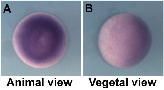 ptp4a3 (protein tyrosine phosphatase type IVA, member 3) gene expression in Xenopus laevis embryo, assayed via in situ hybridization, NF stage 9, animal view (left) and vegetal (right).