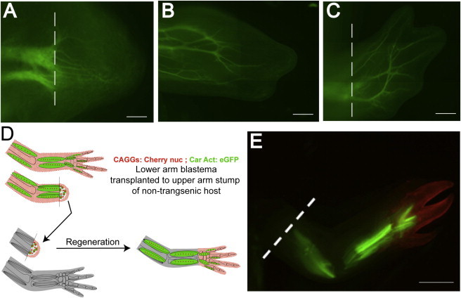 Sobkow, A germline GFP transgenic axolotl and its use to track cell fate: dual origin of the fin mesenchyme during development and the fate of blood cells during regeneration. 2006, Pubmed