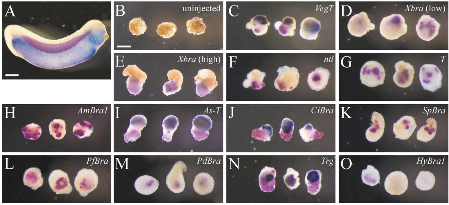 PdBra mRNA; (N) 0.3 ng of Trg mRNA; (O) 6 ng of HyBra1 mRNA. Scale bars represent 400 m in (A), and 200 m in (BâO).