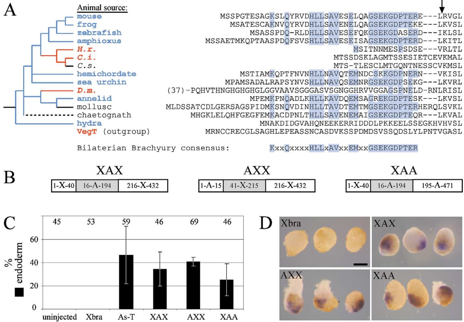 Fig. 5. Endodermal determinants are contained both within the T-box and within its upstream domain. (A) Sequence alignment of the N-terminal amino acids