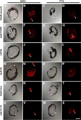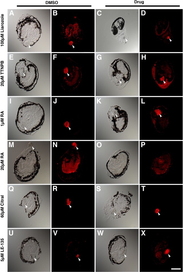 Fig. 3. Lens regeneration assays. Representative examples are shown of positive cases of lens regeneration for each condition tested, with the exception of 20 µM RA, for which no lenses regenerated. Panels (A, E, I, M, Q, U, C, G, K, O, S, and W) are images taken with a DIC microscope. Panels (B, F, J, N, R, V, D, H, L, P, T, and X) are images of fluorescently labeled lenses with an anti-lens antibody (red). Arrowheads indicate the regenerated lens. Scale bar in X=100 µM.