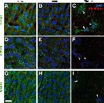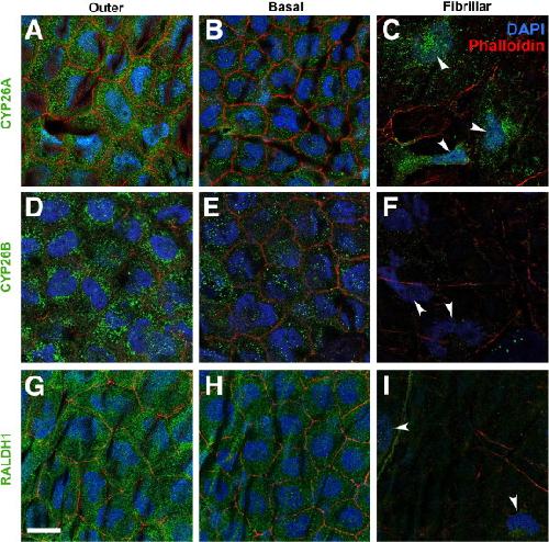 Fig. 6. Cellular localization of CYP26 and RALDH enzymes in the cornea. Corneal whole-mount immunofluorescence staining was used to visualize the expression of CYP26A (AâC), CYP26B (DâF), and RALDH1 (GâI), in each of the 3 layers of the larval corneaâthe outer epithelium (A, D, G), the basal layer (B, E, H), and the deeper fibrillar layer (C, F, I). CYP26A (green) is expressed in all layers, including the sparse cells of the fibrillar layer (arrowheads). CYP26B (green) and RALDH1 (green) are only expressed in the outer epithelial and basal layers, and are not seen in the cells of the fibrillar layer (arrowheads). DAPI (blue), phalloidin (red). Scale bar in G=20 µm.