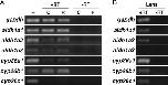 Fig. 1. Expression of RA signaling related genes. (A) Expression of RA-signaling related genes in control corneas (C) and pooled regenerating corneas from 1, 3, and 5 days post-lentectomy (R). “+RT” group indicates reactions that employed reverse transcriptase for generation of cDNA. “–RT” group indicates reactions that used water in place of reverse transcriptase, as a control for genomic contamination. “+” indicates a positive control reaction performed using embryonic RNA. (B) Expression of genes in control lenses.