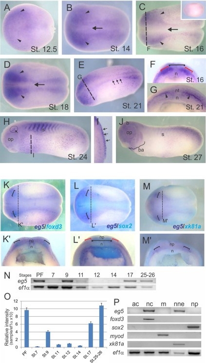 Figure 1. eg5 expression pattern in developing Xenopus embryos. Whole-mount in situ hybridization analysis of spatio-temporal eg5 expression. AâD: Dorsal view, anterior on the left. E: Dorso-lateral view. H, J: Lateral view, anterior on the left, dorsal at the top. F, G, I: Transversal sections. Dashed lines in C, E, and H indicate the sites of transverse section shown in F, G, and I, respectively. A: eg5 transcripts are first detected since the late gastrula stage (stage 12.5) in the dorsal region of embryos at the neural plate and neural plate borders (arrowheads). BâD: During neurulation (stages 14â18), eg5 is expressed in the neural plate borders and in prospective neural crest (arrowheads). No expression is detected in the neural plate midline (arrow). The transversal section of a stage-16 midneurula embryo (F) shows eg5 expression in neural plate (black bracket) and in the neural crest region (red brackets). The transversal section of stage-21 embryo (G) shows eg5 transcripts in the dorsal region of dermatomes (arrowheads). No specific labeling is observed in the sense probe control (C, inset). E: Stage-21 embryos show eg5 expression in the head region, Rohon-Beard sensory neurons (arrows), and the epidermis in a spotted pattern. H: Stage-24 embryos show eg5 expression at the somites, optic vesicle, profundal ganglia primordium (encircled), and epidermis external layer (I). J: The tailbud-stage embryos show the expression at the branchial arches, somites, brain, and epidermis. n, notochord; nt, neural tube; s, somites; b, brain; ba, branchial arches; op, optic vesicle. KâM: Double in situ hybridizations for eg5 (purple) and foxd3 (turquoise), sox2 (turquoise), and xk81a (turquoise). Dorsal view, anterior on the left. K'âM': Transverse sections of St. 15 neurula embryos displayed in KâM showing that eg5 expression overlaps with foxd3 in the neural crest territory (K', black brackets: foxd3 neural crest expression), and is complementary with sox2 and xk81a expressions (L', M'). L': Red brackets, neural crest region; black bracket, neural plate. M': Black brackets, neural crest region. NâP: RT-PCR analysis of eg5 expression in developing embryos. O: Quantification of the gel shown in N, the results are expressed as Relative intensity (sample/ef1α x10). P: RT-PCR analysis of eg5, foxd3, sox2, myod and xk81a expression in neural crest, intermediate mesoderm, neural plate and non-neural ectoderm explants. Explants were dissected out from stage-14 embryos (see Experimental Procedures section). ef1α, loading control. np, neural plate; n, notochord; nc, neural crest; m, intermediate mesoderm; nne, nonneural ectoderm; ac, animal cap (Stage 9).Download figure to PowerPoint |