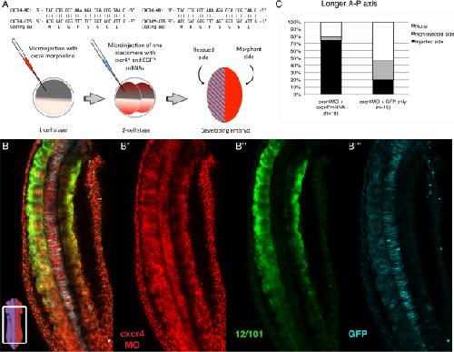 Figure 7. Morpholino-resistant cxcr4* mRNA rescues the cxcr4 morphant phenotype. A: Top: Comparison between endogenous cxcr4 and MO-resistant cxcr4* 5â² coding region sequences (MO binding site). Bottom: Diagram of the experimental strategy, which consists of embryos injected at the one-cell stage with cxcr4 MO, and at the two-cell stage with MO-resistant cxcr4* mRNA and EGFP mRNA (lineage tracer) in one of two blastomeres. B: A merged image of a stage-25 cxcr4 MO rescued embryo. Bottom left: Diagram of an embryo indicating the region imaged. Subsequent series shows individual channels: B': lissamine-tagged cxcr4 MO; B'': muscle fibers stained with 12/101; B''': AlexaFluor anti-GFP indicating the rescued side. Anterior is at the top. C: Graph showing the percentages in which a specific half of the embryo (injected or non-injected) has a longer axis. In some cases neither side is longer and is thus, scored as ânone.â