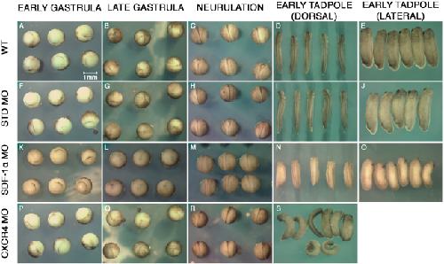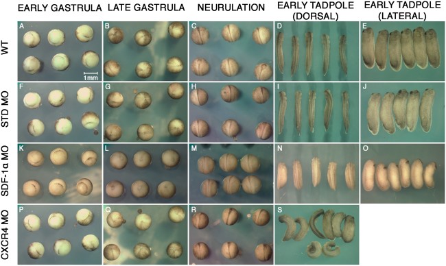 Figure 2. Time-lapse imaging of sdf-1α and cxcr4 half-morphant embryos. Live time-lapse images of wild type embryos (A-E), standard half-morphants (F-J), sdf-1α half-morphants (K-O), and cxcr4 half-morphants (P-S) as they proceed from gastrulation to the formation of early stage tadpoles (stages 26-28). Scale bar in A applies to all frames.