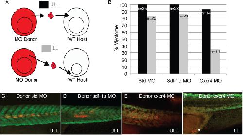 Figure 11. Cell transplantations reveal a role for cxcr4 in the migration of lower lip mesoderm cells. A: Cells from standard, sdf-1α, or cxcr4 morphant embryos were grafted from the upper lateral lip (ULL) region of the blastopore at the mid-gastrula stage to either the ULL or lower lip (LL) region of wild type host embryos at the same stage. B: Grafted embryos developed to stage 39 at which time their ability to form myotome fibers was determined. Confocal images showing that standard (C), sdf-1α (D), and cxcr4 (E) morphant cells give rise to myotome fibers when grafted to the ULL region of wild type embryos. F: A confocal image showing cxcr4 morphant cells grafted to the LL region fail to migrate dorsally and remain closely associated with their original position near the future anus of the tadpole (see white star).
