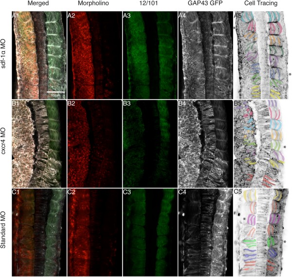 Figure 4. Morpholino depletion of sdf-1α and cxcr4 causes a disruption in somite morphogenesis. Montages of 20à dorsal scans of stage 26 sdf-1α (A.1), cxcr4 (B.1), and standard (C.1) half-morphants highlight the morphologies of cells in the paraxial mesoderm. A.2âC.2: The distribution of the MO along one-half of the embryo is indicated by lissamine fluorescence. A.3âC.3: Whole-mount immunocytochemistry with the muscle-specific antibody, 12/101. A.4âC.4: Black and white images of GAP43 GFP expression. A.5âC.5: Inverted images of the GAP43 GFP expression with pseudo-coloring of cells to highlight a subset of cell shapes within the paraxial mesoderm. Asterisk indicates the first fully rotated somite. Scale bar in A1 applies to all frames. Anterior is at the top.
