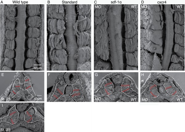 Figure 5. Scanning electron micrographs reveal cell shapes in sdf-1α and cxcr4 morphant embryos. Dorsal images of a stage-26 wild type (A) standard half-morphant (B) embryos with somites composed of elongated and aligned myotome fibers. C: Dorsal image of a stage-26 sdf-1α half-morphant with irregular intersomitic boundaries and a subset of mytome fibers that straddle two segments on the experimental side. D: Dorsal image of a stage-26 cxcr4 half-morphant embryo with disorganized cells and incomplete intersomitic boundaries on the experimental side. Cross-sections of the PSM in wild type embryos at stages 25 (E) and 23 (I). Cross-section through the PSM of stage-26 standard (F), sdf-1α (G), and cxcr4 (H) half-morphant embryos. White tracing highlights the shape of the PSM and includes both the prospective myotome and dermatome. Red tracings highlight the shape of a subset of prospective myotome cells. Scale bar in A applies to all frames except E. Anterior is at the top (AâD). Dorsal is at the top (EâI).