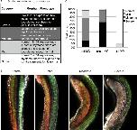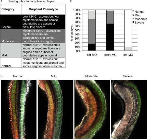Figure 6. Quantification of the sdf-1α and cxcr4 morphant phenotypes. A: Using four categories that range from ânormalâ to âsevere,â sdf-1α, cxcr4, and standard morphant phenotypes are scored. B: Dorsal confocal scans of stage 26 embryos with MO (red) present on the left side, provide examples of the four phenotypic categories ranging from âNormalâ to âSevereâ. Embryos are stained for GAP43 GFP (white) and 12/101 (green). C: A stacked bar graph shows that knockdown of sdf-1α lead to a less severe phenotype in comparison to knockdown of cxcr4. However, knockdown of either sdf-1α or cxcr4 leads to a considerable disruption in muscle formation in comparison to the standard morphants.