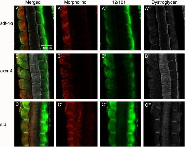 Figure 9. Dystroglycan expression in sdf-1α and cxcr4 half morphants. Stage-26 (A) sdf-1α, (B) cxcr4, and standard (C) half-morphant embryos showing a merged imaged (MO-lissamine, 12/101 and dystroglycan). A'âB': Distribution of the lissamine-tagged MO. A''âB'': Immunolocalization of the muscle-specific marker, 12/101. A'''âB''': Images were converted to black and white to better visualize the distribution of dystroglycan on the morphant side in comparison to the control side. Scale bar in A applies to all frames. Anterior is at the top.