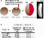 Figure 1. Experimental approach to the morpholino knockdown of sdf-1α and cxcr4. A: A schematic of the experiment in which one blastomere at the 2-cell stage is injected with a specific morpholino (MO) such that only half of the embryo is morphant. The embryo is then allowed to develop to tailbud stages and then fixed and analyzed. B: A table indicating the specific amounts of MO injected into the fertilized egg or one blastomere at the two-cell stage.
