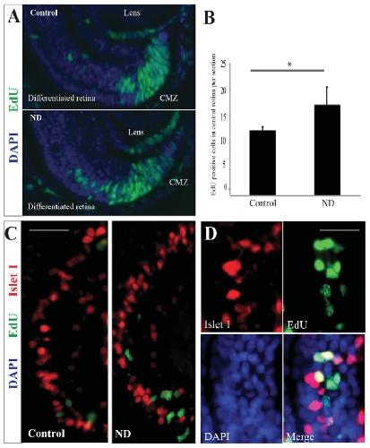 Fig. 3. Committed progenitor cells continue to differentiate normally following ND. (A) Many cells labelled with EdU 20 minutes prior to ND were found in the differentiated central retina after a 3-day chase period. n=3, 12 embryos/condition. (B) These cells increased in number in the ND condition compared with control retinas. n=3, 12 embryos/condition. Error bars show 95% confidence intervals; *Pâ¤0.05 (unpaired t-test). (C,D) High magnification of the central retina, which contains differentiated cells. Some EdU-labelled cells were also positive for the neuronal marker Islet1, which marks specific subsets of amacrine and bipolar cells in the inner nuclear layer of the differentiated retina. n=3, 12 embryos/condition. Scale bars: 40 μm (C); 10 μm (D). |