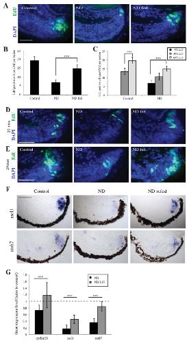 Fig. 4. Re-feeding promotes reconstitution of the CMZ. (A,B) Explanted retinas from ND embryos grown in L15 medium containing sugars and amino acids for 24 hours showed an increase in CMZ proliferation after a 2-hour pulse with EdU. n=3, 18 retinas/condition. (C) This increase in proliferation varied with nutrient levels, suggesting that nutrients can regulate proliferation within a dynamic range. n=3, 18 retinas/condition. (D,E) Proliferation was initiated in the CMZ as early as 20 minutes after re-feeding (D), with robust proliferation being observed 2 hours after the addition of nutrients (E). (F,G) After culture for 24 hours in L15, a strong upregulation of Cyclin D1 and the proneural genes ascl1 and atoh7 was observed in re-fed retinas. n=3, 18 retinas/condition. (B,C,G) Error bars show 95% confidence intervals; ***Pâ¤0.001 (unpaired t-test). Scale bars: 50 μm (A,D,E,F). |