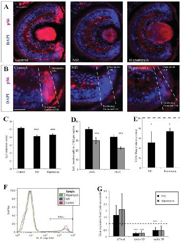 Fig. 7. Activation of mTOR signalling is sufficient to maintain the progenitor pool. (A,B) Activation of mTOR with bpV rescues pS6 to a level 70% of that of controls in ND retinas (top row), specifically in CMZ progenitor cells (bottom row). Dashed lines encircle the CMZ. n=4, 16 embryos/condition. (C-F) bpV treatment rescued the downregulation of genes observed following ND, without affecting the expression of stem cell markers. n=4, 16 embryos/ condition. (B-E) Error bars show 95% confidence intervals; ***Pâ¤0.001, *Pâ¤0.05 (unpaired t-test). Scale bars: 100 μm (A, top panel); 50 μm (A, bottom panel); 50 μm (F). |