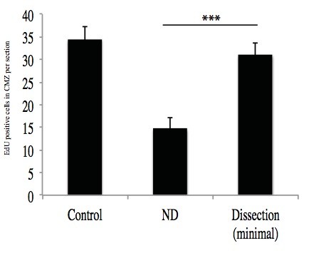 Sup.Fig.3 Decreased proliferation after ND is not due to injury: Minimal dissection with less than 25% of the yolk removed does not impair proliferation, n= 8-13 embryos, 2 hour EdU pulse, dissection from St. 35 to St. 42., ***p< 0.001. |
