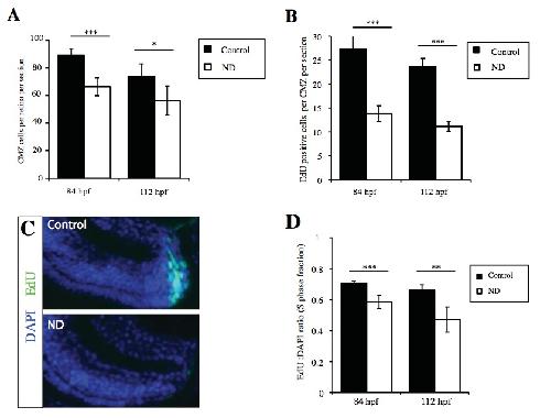 Sup.Fig.4 ND also results in decreased proliferation in the Zebrafish retinal CMZ CMZ proliferation was significantly decreased in 84hpf and 112hpf nutrient deprived zebrafish at 56hpf. Nutrient deprived fish had fewer CMZ cells (A) and decreased EdU incorporation (B-C). (D) The proportion of CMZ cells that were EdU positive in S phase decreased suggesting cell cycle slowdown. Error bars show 95% C.I. Unpaired t test, n=9-29 retinas ***p=<0.001, **p=<0.01, *p=<0.05 |