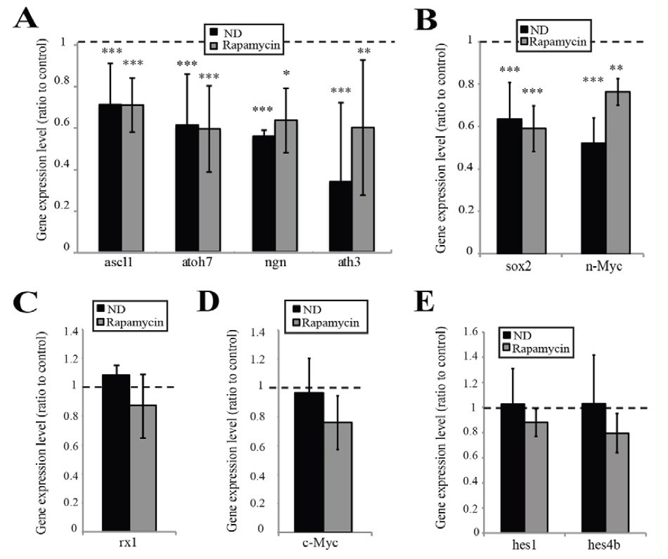 Fig. 6. Activation of mTOR by nutrients is necessary for neural commitment and differentiation but not for the maintenance of the most immature stem/progenitor cells. (A,B) Proneural gene expression levels were decreased in ND and rapamycin-treated embryos (A), as were levels of the progenitor markers sox2 and n-Myc (B). n=8, 32 embryos/condition. (C) Expression of the eye field transcription factor gene rx-1 remained unchanged by ND. n=4, 16 embryos/condition. (D) c-Myc expression levels remained unchanged; however, the domain of c-Myc expression was reduced in the central CMZ of ND and rapamycin-treated embryos. n=8, 32 embryos/condition). (E) Expression levels of the stem cell marker genes hes1 and hes4 remained unchanged (n=4, 16 embryos/condition. In all cases, error bars show 95% confidence intervals; ***P≤0.001, **P≤0.01, *P≤0.05 (unpaired t-test). |