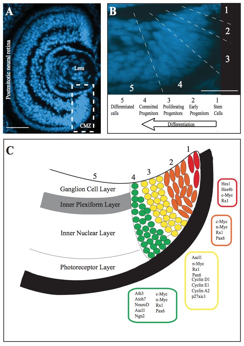 Sup.Fig.1 The CMZ as a model to study nutrient deprivation (A) DAPI labelled sagittal section through a stage 41 retina, showing the location of the Ciliary Marginal Zone (CMZ). (B) DAPI stained transverse section of the CMZ showing the spatial recapitulation of the temporal progression of neurogenesis. (C) Schematic representation of gene expression patterning in the CMZ of the stage 41 embryo. Scale bars: A = 100μm, B= 25μm |