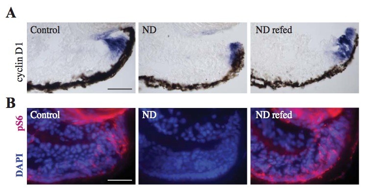 Sup.Fig.6 Re-feeding rescues pS6 expression (A) After culture for 24 hours in 60% L15 a statistically significant upregulation of Cyclin D1 was observed in refed retinas. (B) Re-feeding with 60% L15 results in the reactivation of mTOR signalling in the CMZ as indicated by increased pS6 expression specifically in the proliferating progenitor cells. Scale bars = 50μm |