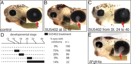Figure 1. Fgfr signaling during the eye field stage, but not later, is critical for proper eye morphogenesis. AâC: Lateral wholemount views of the head and enlarged eye of Stage-40 Xenopus laevis embryos incubated in a control DMSO solution (A) or 150â200 μM solution of the Fgfr inhibitor, SU5402, for 5 hr beginning at developmental Stage 12 (B) or continuously from Stage 24 through to Stage 40 (C). Red arrows point to the choroid fissure. D: The percentage of eyes exhibiting a gap (i.e. coloboma) of the choroid fissure for the various inhibitor treatment groups. The black stripe indicates the time spent exposed to the Fgfr inhibitor solution, whereas the dashed line indicates time spent in 0.1à Marc's Modified Ringer solution. E: Lateral view of a Stage-40 embryo injected with δfgfr4a::gfp mRNA into D1.1 blastomeres at the 16-cell stage.Download figure to PowerPoint