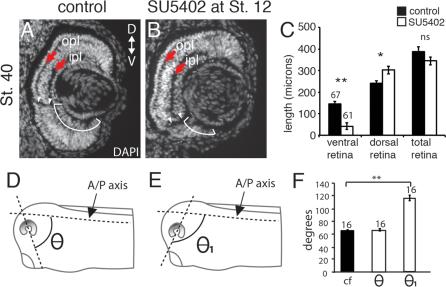 Figure 3. An early Fgf signal is required for development of the ventronasal retina. A, B: DAPI-labeled transverse cryosections of the eyes of Stage 40 Xenopus laevis embryos incubated in a control DMSO solution (A), or 150â200 μM solution of SU5402 (B) for 5 hr beginning at Stage 12. The dorsoventral axis, optic nervehead (white arrowheads), inner plexiform layer (ipl) and outer plexiform layer (opl) (red arrows) of the eye are indicated. C: The distance from the optic nervehead to the lateral edge of the dorsal and ventralretina was measured in control and inhibitor treated embryos using the ipl as a guide. D, E: The angle between the anteroposterior (A/P) axis and a line bisecting the eye and contacting either the central edge of the ventrotemporal (θ, D) or ventronasal (θ1, E) retina was measured in those Fgfr inhibitor-treated embryos that exhibited coloboma. F: These angles were compared to the angle between the A/P axis and a line bisecting the eye through the choroid fissure (cf) in control embryos. Values in graphs are meanâ±âSEM, and average values were compared where indicated using unpaired t-tests. *Pââ¤â0.05, **Pâ<â0.01.Download figure to PowerPoint