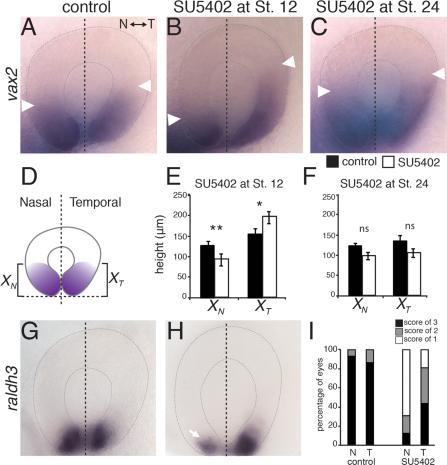 Figure 5. Inhibition of Fgfrs during the eye field stage results in expansion of dorsal markers in the nasal retina. AâC: Representative images of tbx3 expression in the eyes of Stage 32 embryos exposed to control or SU5402 solutions for 5 hr at Stage 12 (A, B), or Stage 24 (C). The ventral boundary of expression domains is indicated (arrowheads). D: The distance from the ventralretina to the ventral boundary of the tbx3 or bmp4 expression domains in the nasal (X-N) and temporal (X-T) retina was measured in control- and Fgfr inhibitor-treated embryos. E, F: The tbx3 expression domain is expanded in the nasal retina (therefore the distance to the base of the domain is diminished) and unchanged in the temporal retina after SU5402 treatment at Stage 12 (E; N=4 experiments with a minimum 8 embryos/group), and unchanged in both the nasal and temporal retina after treatment at Stage 24 (F; N=3 experiments with a minimum of 8 embryos/group). G, H: Lateral view of the eyes of Stage 32 embryos treated with a control or SU5402 solution at Stage 12. I: The bmp4 domain is expanded in the nasal retina and unchanged in the temporal retina (bmp4, N=2 experiments with a minimum of 7 embryos/group). Values in graphs are mean distanceâ±âSEM; means were compared using unpaired t-tests. *Pâ<â0.05, **Pâ<â0.01). Grey dashed line in A, B, C, G, H indicates the outline of the developing neural retina, and the black dashed line divides the retina into nasal and temporal halves.Download figure to PowerPoint