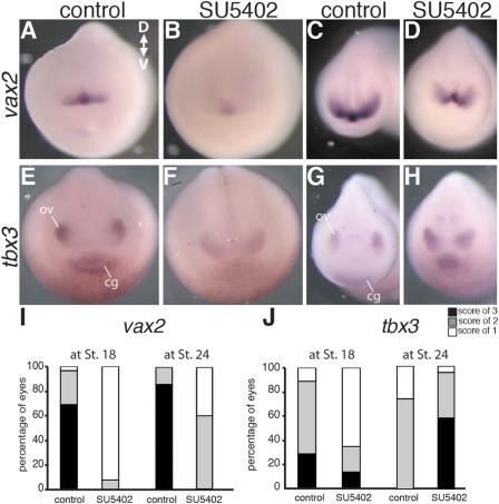 Figure 6. Inhibition of Fgf signaling at the eye field stage triggers early changes in the expression and position of markers of retinal DV polarity. AâH: vax2 (AâD) and tbx3 (EâH) expression was assessed immediately following the inhibitor incubation period (A, B, E, F; approximately Stage 18) and at Stage 24 (C, D, G, H) in embryos treated for 5 hr at Stage 12 with control or SU5402 solutions. I, J: The intensity of the in situ hybridization label was scored from 1 (lightest) to 3 (darkest) and the percentage of the eyes receiving each score for vax2 (I) and tbx3 (J) is plotted for control and SU5402-treated embryos. The dorsal/ventral axis, cement gland (cg), and optic vesicle (ov) are labeled.Download figure to PowerPoint