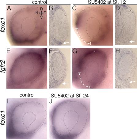 Figure 7. An early Fgf signal is important for development of the ventronasal periocular mesenchyme (POM). AâD, I, J: foxc1 expression in the POM around the eye at Stage 32 in embryos treated with control or Fgfr inhibitor solutions at Stage 12 (AâD) and Stage 24 (I, J). EâH: fgfr2 expression in the POM of Stage-32 embryos treated with a control or SU5402 solution at Stage 12. White dashed lines indicate the gap in expression as seen in the lateral view of wholemount embryos after in situ hybridization for foxc1 or fgfr2 expression in the POM of Stage-32 embryos treated with a control. Images in B, D, F, and H are of vibratome transverse sections through the eyes (outlined with black dots) of wholemount embryos, and the white arrows indicate the ventralPOM, where expression is diminished after SU5402 treatment. Grey dashed lines iindicate the outline of the developing neural retina.Download figure to PowerPoint