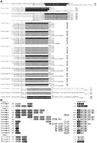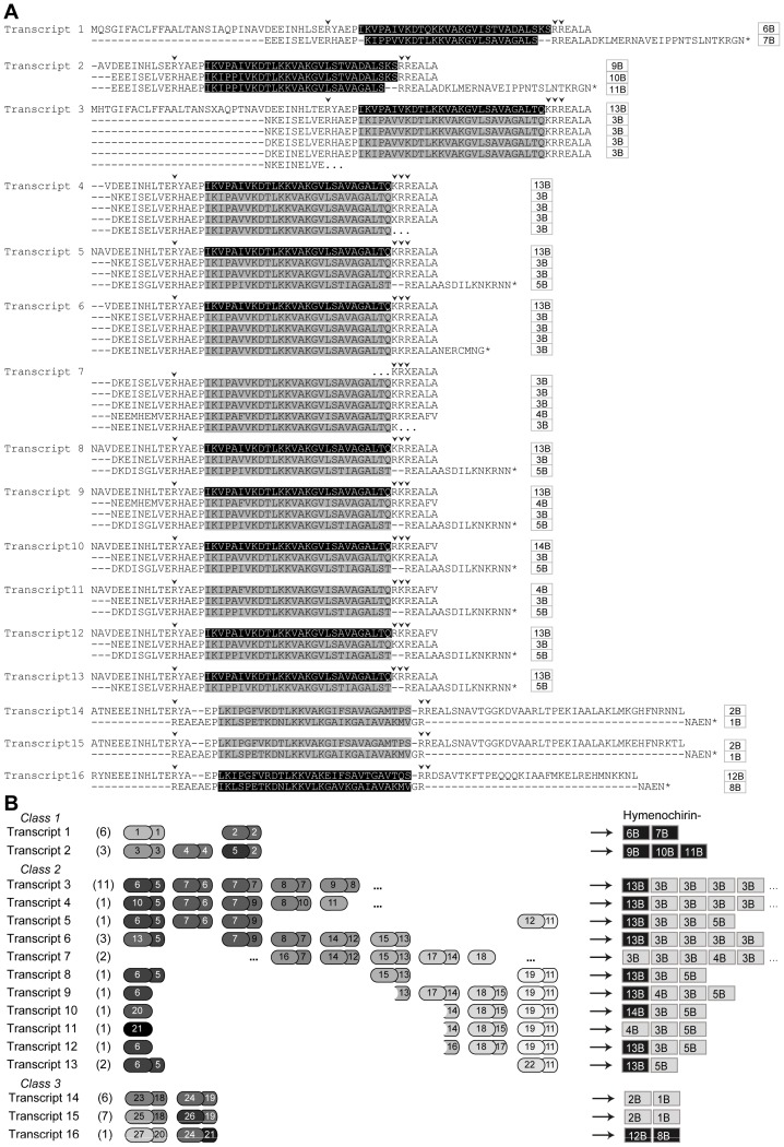 Figure 2. Overview of hymenochirin transcripts: amino acid sequences, structure and encoded peptides.A Deduced amino acid sequences of the hymenochirin transcripts. Previously published hymenochirins [27] are marked in grey; predicted novel encoded hymenochirins are marked in black. Small arrowheads indicate putative cleavage sites for the hymenochirins. Names of encoded hymenochirins are indicated on the right. B Comparative schematic representation of repeat sequences in the transcripts. The number of cDNA sequences represented by each transcript is indicated between brackets. Each repeat is represented by one larger and one smaller block (repeat sections), corresponding to exons 2 and 3 in S. tropicalis and X. laevis AMP genes. The numbers in the blocks correspond to unique repeat sections as used in the phylogenetic analyses. Hymenochirins encoded by the corresponding transcripts are indicated on the right; previously published hymenochirins [27] are labeled grey, the novel hymenochirins are labeled black.