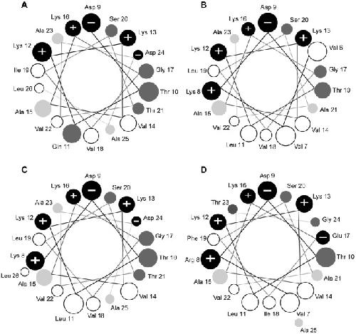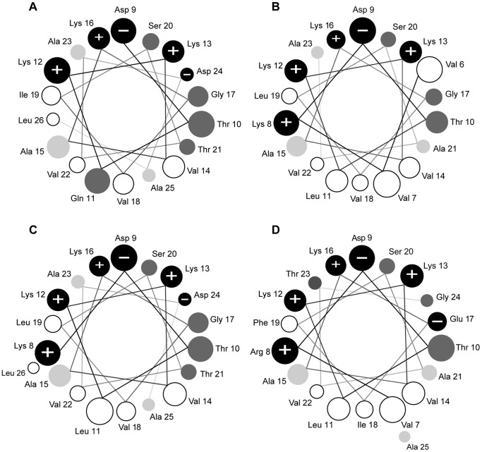 Figure 5. Helical wheel projections of the four peptides that were synthesized and tested for antimicrobial activity.A hymenochirin-6B; B hymenochirin-7B; C hymenochirin-10B; D hymenochirin-12B. Only the region of the peptide predicted to have an alpha-helical structure with a confidence level of 5 or more (PSIPRED v3.0 [30]) is shown in the projection. Amino acids are shaded according to the Combined Consensus Scale [31] with hydrophobic residues in white, nearly neutral residues in light grey, polar residues in dark grey, charged residues in black with+or - sign indicating charge. Helical wheels are adapted from http://cti.itc.virginia.edu/~cmg/Demo/wheel/wheelApp.html. Circle sizes indicate the relative distance from the N-terminal end of the peptide; smaller circles are further away.