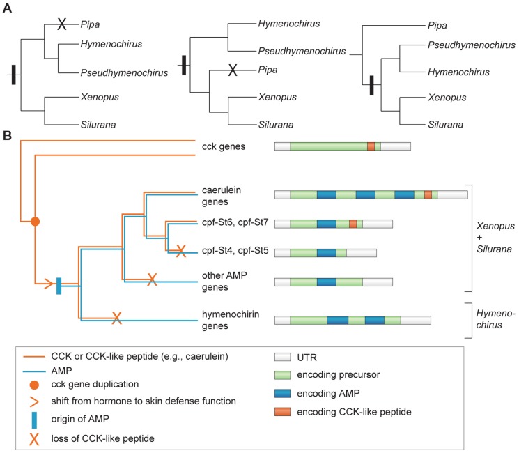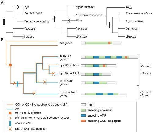 Figure 7. Figure 7. Origin and loss of AMPs and CCK-like peptide in the family Pipidae.A The three recently postulated phylogenetic hypotheses for the family Pipidae and their implications for the origin (vertical bars) and loss (crosses) of an AMP gene repertoire. B Summarized gene tree illustrating the evolution of the pipid AMP gene family.