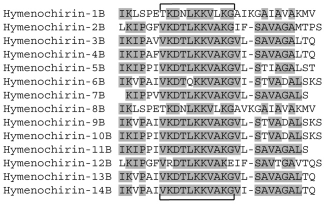 Figure 3. Alignment of all known and predicted hymenochirin peptides.Amino acids shared by more than 50% of the peptides are marked in grey. Brackets delineate a conserved central sequence motif.