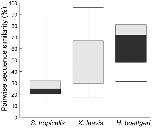 Figure 4. Comparison of pairwise sequence similarities between AMPs of H. boettgeri, S. tropicalis and X. laevis.Box plots comparing the distribution of pairwise sequence similarities (in %) between the 14 hymenochirins of H. boettgeri and all known AMP peptides of S. tropicalis and X. laevis respectively. Boxes indicate median, and 25- and 75- percentiles, and whiskers indicate minimum and maximum values.