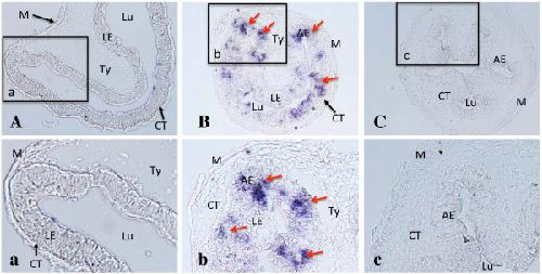 Figure 6. In situ hybridization analysis suggests specific expression of HAL2 in the proliferating adult intestinal progenitor/stem cells. ISH on intestinal cross-sections at stages 54 (A), 61 (B), and 66 (C) was carried out with anti-sense probe for HAL2. An enlarged photo of the boxed areas (a, b, c) in the top panels are shown in the lower panels. Note that HAL2 staining was found to be in clusters of cells located in between the dying larval epithelial cells and connective tissue at the climax of metamorphosis, where the proliferating adult epithelial cells are located [8,19,36,48], consistent with the expression data in Figures 3 and 4. AE, adult epithelium; CT, connective tissue; Lu, lumen; LE, larval epithelium; M, muscle; Ty, typhlosole.