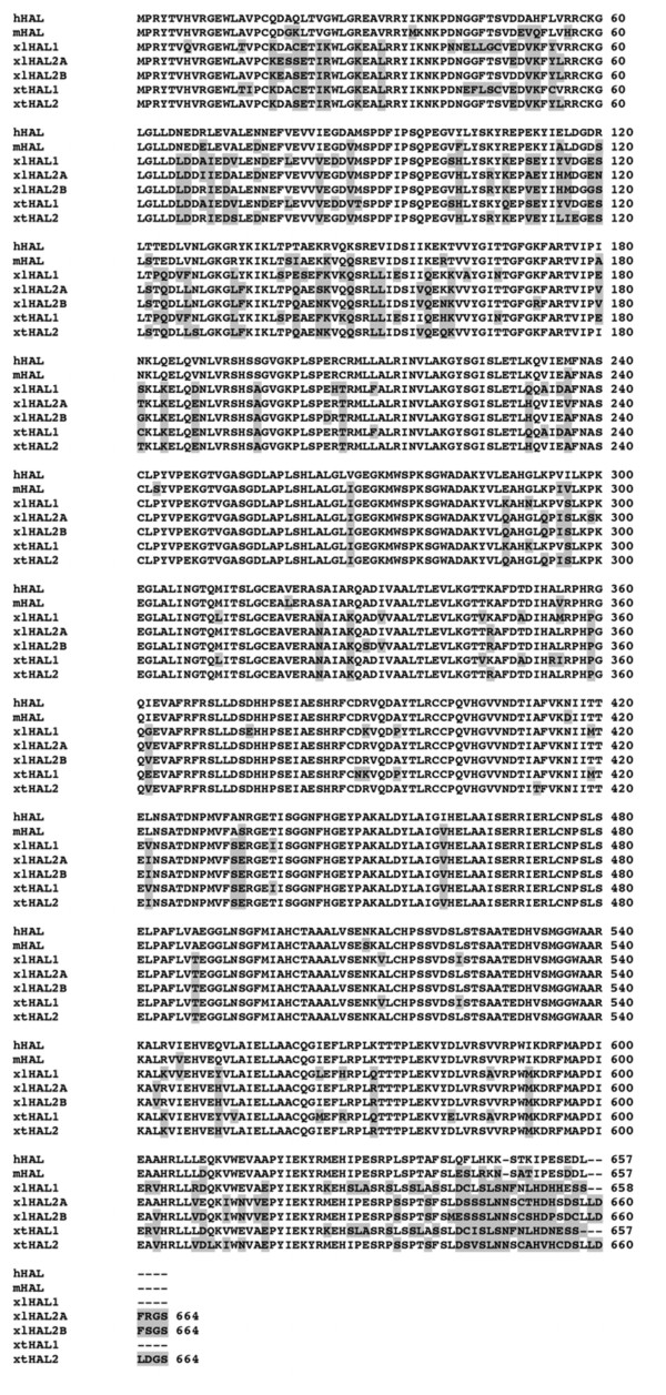Figure 1. The two Xenopus histidine ammonia lyase (HAL) genes encode proteins highly homologous to mammalian HAL. Sequence alignment was carried out among the human (h), mouse (m) and the three HALs from Xenopus laevis (xl) and two HALs Xenopus tropicalis (xt), a diploid species. Note that the proteins are highly homologous throughout the entire length. The HAL1 and HAL2 from Xenopus laevis and Xenopus tropicalis shared about 84% identity between each other, similar to their homologies to the mammalian HAL.