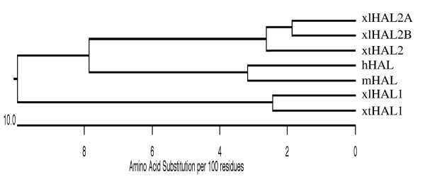 Figure 2. Phylogenetic tree of HALs from different species as shown in Figure1suggests that the two HAL genes were duplicated after the separation of mammals and amphibians but prior to the separation of