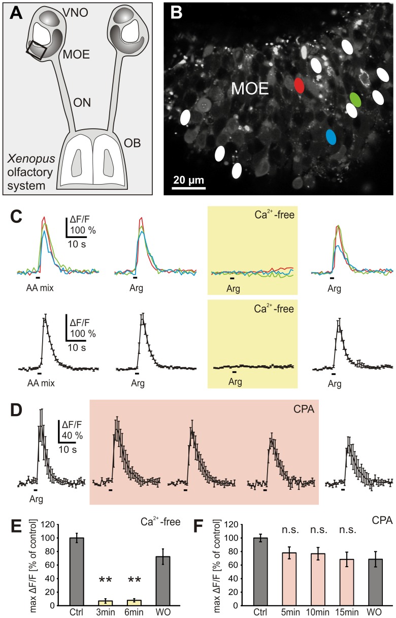 Figure 1. Amino acid-induced Ca2+ responses depend on extracellular Ca2+ and are independent of store depletion. A, schematic representation of the olfactory system of larval Xenopus laevis. The black rectangle indicates the approximate epithelial region of the slice shown in B. B, Fluo-4 stained acute slice of the MOE. The ovals represent all L-arginine-sensitive ORNs of this slice. C, time courses of intracellular Ca2+ transients of three amino acid-responsive ORNs (colored traces, see ovals in B) stimulated with a mixture of 19 amino acids (100 µM each) or L-arginine (100 µM) in standard and Ca2+-free bath solution. The L-arginine responses were abolished in Ca2+-free solution (yellow-shaded panel; application for 3 min) and recovered in standard bath solution. Mean Ca2+ transients ± SEM of all L-arginine-sensitive ORNs of the slice in B (11 ORNs) are shown in the lower part (black traces). D, depletion of intracellular Ca2+ stores via application of CPA (20 µM; light-red-shaded panel) did not affect L-arginine-evoked Ca2+ responses (shown as mean ± SEM of all three responsive ORNs of another acute MOE slice. E, mean responses (±SEM), expressed as percentage of control response to L-arginine, of 33 ORNs (11 slices) in standard (dark grey columns) and Ca2+-free bath solution (yellow columns; respectively 3 and 6 min after application of Ca2+-free bath solution). The responses were virtually abolished in Ca2+-free bath solution (**p<0.01; paired Student's t-test). F, mean responses (±SEM), expressed as percentage of control response to L-arginine, of 28 ORNs (6 slices) in standard (dark grey columns) and bath solution with 20 µM CPA (light-red columns; respectively 5, 10 and 15 min after application of CPA). Washout time was 5 min. No significant reduction of the Ca2+ responses was observed (p>0.05; paired Student's t-test). [AA mix, amino acid mixture; Arg, L-arginine; Ctrl, control; n.s., non significant; OB, olfactory bulb; ON, olfactory nerve; WO, washout]. |