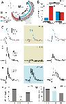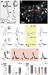 Figure 5. TRP channel blockers affect most of the L-arginine-induced responses.A, L-arginine-induced Ca2+ responses of two ORNs of an individual slice of the lateral MOE (cyan and red trace). Incubation with 2-APB (100 µM; application for 5 min; orange-shaded panel) led to a strong reduction of the Ca2+ transient in one of the ORNs (red trace), whereas the second ORN was not affected (cyan trace). The response of the affected ORN recovered after 10 min of washout (right-hand traces). The bar diagram shows ORNs unaffected and affected by 2-APB (100 µM; 5 min), expressed as percentage of total ORNs tested (27 cells, 6 slices). B, mean Ca2+ transient (±SEM) of seven L-arginine-responsive ORNs of an acute slice preparation (lateral MOE; only blocker-affected ORNs included). With 2-APB in the bath solution (100 µM; 5 min; orange-shaded panel) the mean response is partially suppressed. After 10 min washout the response recovered almost completely (right-hand trace). The bar diagram shows that application of 2-APB (100 µM; 5 min) reduced the amplitude of the Ca2+ transients to 27% of the control application (24 ORNs, 6 slices). C, L-arginine-induced Ca2+ responses of two ORNs of another individual slice of the lateral MOE (cyan and red trace). Incubation with SKF-96365 (80 µM; 10 min; lilac-shaded panel) led to a strong reduction of the Ca2+ transient in only one of the two ORNs (red trace). The response of the affected ORN recovered after 10 min of washout (right-hand traces). ORNs unaffected and affected by SKF-96365, expressed as percentage of total ORNs tested (histogram; 25 cells, 4 slices). D, mean Ca2+ transient (±SEM) of four L-arginine-responsive ORNs of an acute slice preparation (lateral MOE; only blocker-affected ORNs included). With SKF-96365 in the bath solution (80 µM; 10 min; lilac-shaded panel) the mean response is partially suppressed. After 10 min washout the response slightly recovered (right-hand trace). Application of SKF-96365 (80 µM; 10 min) reduced the amplitude of the Ca2+ transients to 35% of the control application (bar diagram; 21 ORNs, 4 slices). Statistical analysis was performed using paired Student's t-test; *p<0.05, **p<0.01. [SKF, SKF-96365]. |