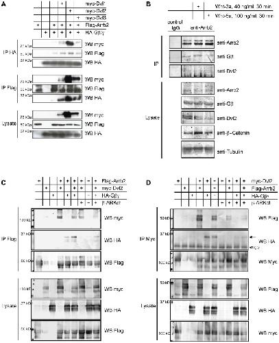 Figure 5. Arrb2 physically interacts with Gβ and Dvl.Epitope-tagged proteins were overexpressed, immunoprecipitated and detected by Western Blotting as indicated. (A) Flag-Arrb2 was co-expressed with a combination of HA-Gβ1 and HA-Gγ2 to allow the formation of Gβγ heterodimers (Gβγ). Co-expression of Dvl1, Dvl2 or Dvl3 enhanced the interaction between Arrb2 and Gβ1 in co-immunoprecipitation experiments from HEK 293T cells. (B) Endogenous Gβ and Dvl2 were detected in immunoprecipitates of endogenous Arrb2 from unstimulated and Wnt-stimulated HEK 293T cells. (C) Binding of Dvl2 to Arrb2 was also observed in the absence of exogenous Gβ. Myc-Dvl2 co-precipitated equally well with Flag-Arrb2 when Gβ1 and Gγ2 were overexpressed (Gβγ) as in the presence of the Gβ-sequestering β-ARKct in HEK 293T cells. By contrast, binding of Gβ1 to Arrb2 was impaired by β-ARKct and partially restored by co-expression of Dvl2. (D) When myc-Dvl2 was precipitated, the amount of Flag-Arrb2 and that of Gβ1 that co-precipitated with Dvl2 was significantly reduced by the co-expression of β-ARKct.