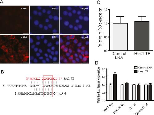 Figure S1. miR-9 Expression in the Neural Progenitor Cell Line 17.2, Related to Figure 1(A) In situ analysis for mature miR-9 expression in c17.2 cells using LNA probes. miR-1 was used a negative control. Scale bar = 20mm (B) Design of the Hes1 target protector oligo directed against Hes1 miR-9 binding site. Seed region is boxed in red. (C) Hes1 TP does not affect mature miR-9 levels in c17.2 cells, as analyzed by qRT-PcR. (D) Relative luciferase expression of different miR-9 target reporters in c17.2 cells trasnfected with either control LNA or Hes1 TP LNA oligos. Hes1 TP upregulates the expression of only Hes1 luciferase reporter but does not affect other miR-9 targets.