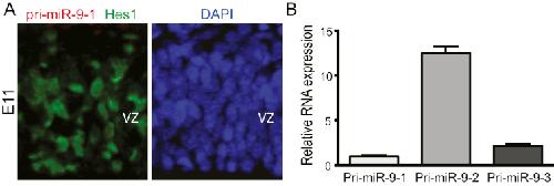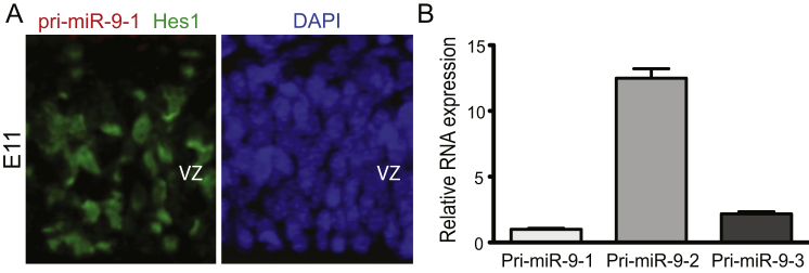Figure S3. Expression of Primary miR-9 Transcripts in the Mouse Cortex and c17.2 cells, Related to Figure 3(A) Double fluorescent in situ hybridization (FISH) for pri-miR-9-1 (red) Hes1 mRNA (green) on cryosections from E11 mouse cortex VZ-ventricular zone.(B) qRT-PCR for pri-miR-9 levels in c17.2 neural progenitor cells.