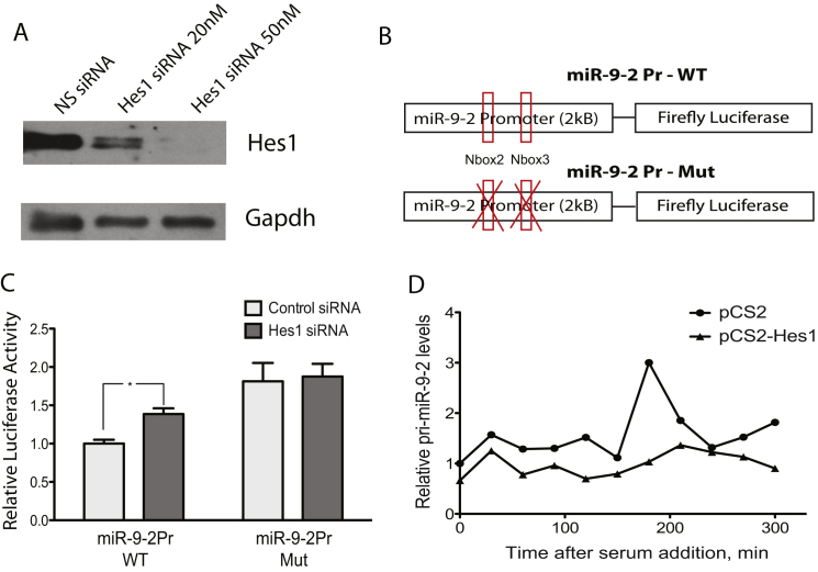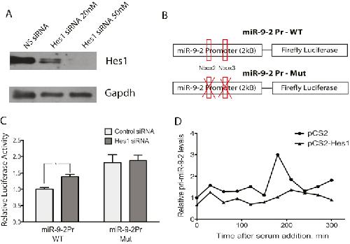 Figure S4. Hes1 Regulates miR-9 Expression, Related to Figure 4(A) Hes1 protein levels are reduced when c17.2 cells are transfected with Hes1 siRNA. Gapdh was used as a loading control. NS- non-specfic control.(B) Putative miR-9-2 promoter fragment (∼2 kB) was inserted upstream of luciferase in the pGL3 vector to make miR-9-2Pr-WT construct. miR-9-2-Mut was constructed by mutating 2 Hes1 binding sites.(C) Knockdown of Hes1 using siRNA upregulates the expression of the wild-type miR-9-2 reporter, but has no effect on the mutant reporter.(D) Relative expression of pri-miR-9-2 in c17.2 cells transfected with either control vector (pCS2) or Hes1 (pCS2-Hes1), analyzed by qRT-PCR. Hes1 overexpression represses the pri-miR-9-2 transcription peak.