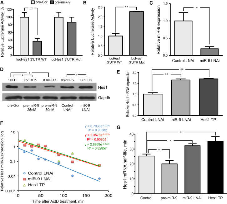 Figure 1. miR-9 Regulates Mouse Hes1 Expression at the RNA Level(A) A luciferase reporter fused to either the wild-type (lucHes1 3′ UTR WT) or mutant Hes1 3′ UTR which has a deletion in the seed-complementary region of the miR-9 binding site (lucHes1 3′ UTR Mut), was transfected together with either scrambled (pre-Scr) or miR-9 precursors (pre-miR-9) in HeLa cells. Luciferase expression was normalized and expressed relative to the control levels.(B) Expression of the wild-type or mutant luciferase reporter transfected in the neural progenitor cell line c17.2.(C) Mature miR-9 levels in c17.2 cells after transfection with either control LNA inhibitor (Control LNAi) or miR-9 LNA inhibitor (miR-9 LNAi), as measured by qRT-PCR at 48 hr.(D) Representative western blot analysis for endogenous Hes1 protein levels in c17.2 cells, 48 hr after transfection with scrambled/miR-9 precursors or control LNA/miR-9 LNA inhibitor. Values represent fold change in expression from three independent experiments ±SEM.(E) qRT-PCR analysis for Hes1 mRNA levels after transfection with control LNA, miR-9 LNA inhibitor, or Hes1 target protector LNA (Hes1 TP). Expression was normalized for the housekeeping gene Gapdh and expressed as a fold change compared to the control.(F) Hes1 mRNA degradation rate was measured after transcription block at t = 0. Relative Hes1 expression (normalized for Gapdh) was plotted on a log scale and nonlinear regression using exponential fit was used to determine the degradation rate (k) according to the equation y = Ae−k.(G) Half-life (t1/2) of Hes1 mRNA in c17.2 cells transfected with control LNAi, miR-9 (pre-miR-9), miR-9 LNAi or Hes1 TP. Half-life was determined by the formula t1/2 = ln(2)/k.Data are represented as mean ± SEM. ∗p < 0.05; ∗∗p < 0.01; ∗∗∗p < 0.001 analyzed by Student's t test. See Figure S1.
