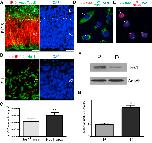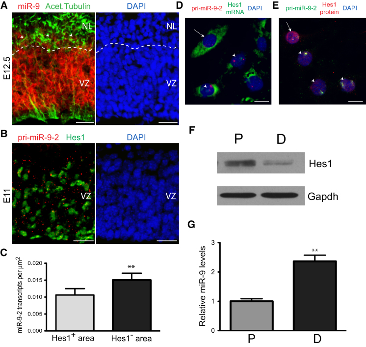 Figure 3. miR-9 Transcription Is Inversely Related to Hes1 Levels(A) At stage E12.5 mature miR-9 (red) is mainly expressed in the ventricular zone of the developing neocortex, but is also present in some differentiating neurons, positive for acetylated tubulin (arrowheads). VZ, ventricular zone; NL, neuronal layer.(B) Primary miR-9-2 transcripts are more abundant in the Hes1 negative cells in the ventricular zone, compared to Hes1 positive progenitors, as examined by double fluorescent in situ.(C) Quantification of the miR-9-2 expression pattern in the mouse VZ (n = 9 sections, 2 embryos).(D and E) pri-miR-9-2 and either Hes1 mRNA (D) or Hes1 protein (E) are expressed in an inverse relationship in single neural progenitor c17.2 cells. In both (D) and (E), arrow indicates a cell with high Hes1 levels, but low miR-9-2, while arrowheads indicates low Hes1/high miR-9-2 cells.(F) Hes1 protein levels are downregulated upon differentiation of c17.2 cells; P, proliferative conditions (10% serum); D, differentiation conditions (0.2% serum).(G) miR-9 levels are upregulated upon neuronal differentiation in c17.2 cells.Data are presented as mean ± SEM. ∗∗p < 0.01, Scale bars = 20 μm. See Figure S3.