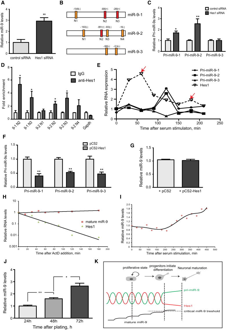 Figure 4. Hes1 Negatively Regulates miR-9 Transcription(A) The expression levels of mature miR-9 in c17.2 cells transfected with either control or Hes1 siRNA as examined by qRT-PCR.(B) Bioinformatic prediction for the presence of Hes1 binding elements (N-boxes) in the 2 kB regions upstream of the miR-9 precursors. N-boxes in the (+) strand are depicted in red, while N-boxes in the (–) strand are in orange.(C) qRT-PCR for relative levels of the primary miR-9 transcripts in c17.2 cells transfected with control siRNA or Hes1 siRNA.(D) Recruitment of endogenous Hes1 to miR-9-1 and miR-9-2 promoters as revealed by ChIP-qPCR. IgG, negative control; Gapdh, Gapdh promoter sequence.(E) Dynamic expression of Hes1 mRNA and the three primary miR-9 transcripts analyzed by qRT-PCR in synchronized c17.2 cells upon serum stimulation at t = 0 (Hes1 peaks are indicated with arrows).(F) qRT-PCR for relative levels of the primary miR-9 transcripts in c17.2 cells transfected with either control (pCS2) vector or Hes1 (pCS2-Hes1).(G) The expression levels of mature miR-9 in c17.2 cells transfected with either control or Hes1 vector as examined by qRT-PCR.(H) qRT-PCR for expression levels of mature miR-9 compared to Hes1 mRNA after blocking transcription with Actinomycin D.(I) Relative expression of mature miR-9 analyzed by qRT-PCR in synchronized c17.2 cells upon serum stimulation at t = 0.(J) qRT-PCR for mature miR-9 levels in c17.2 cells grown in proliferating conditions (10% serum) 24, 48, and 72 hr after plating.(K) Model depicting the oscillations of pri-miR-9 s driven by Hes1, which leads to the gradual accumulation of mature miR-9 and eventual dampening of the oscillations, followed by neural differentiation On all panels values are represented as mean ± SEM. ∗p < 0.05; ∗∗p < 0.01; ∗∗∗p < 0.001 analyzed by Student's t test.See Figure S4.