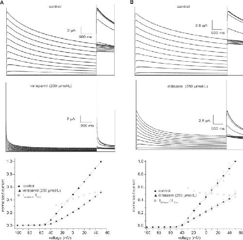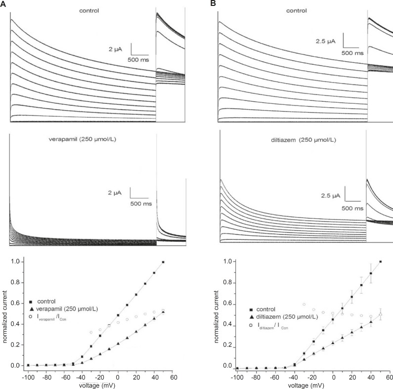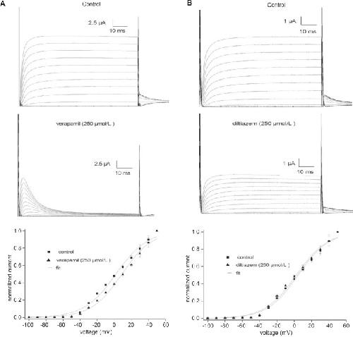 Figure 1. Effects of verapamil (A) and diltiazem (B) on fKv1.4ΔN channels expressed in Xenopus oocytes. Representative curves are shown for 5-second depolarizing pulses from -90 mV to voltages between –100 and +50 mV in steps of 10 mV. Upper panels: traces recorded under control conditions. Middle panels: current traces obtained in the presence of 250 μmol/L verapamil or 250 μmol/L diltiazem. The peak currents in the presence of verapamil and diltiazem were poorly resolved from the capacitance transient on this time scale. Bottom panels: effects of 250 μmol/L verapamil and 250 μmol/L diltiazem on the peak current-voltage (I-V) relationships. Currents were normalized to the peak current at +50 mV under control conditions. The IDrug/IControl ratio was plotted as a function of the membrane potential. Data are shown as mean ± SEM (n = 5).
