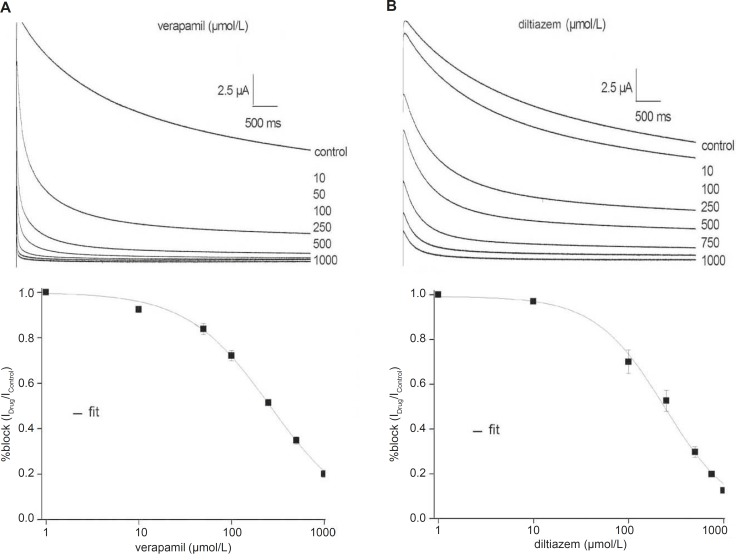 Figure 2. Concentration-response relationships for the inhibition of the fKv1.4ΔN currents by verapamil (A) and diltiazem (B). Upper panels: Representative current traces were elicited in the absence and presence of increasing concentrations of verapamil (A) and diltiazem (B). Currents were recorded by depolarizing pulses to +50 mV from a holding potential of –90 mV. Lower panels: The peak currents were normalized the maximum peak current under control conditions and plotted against verapamil (A) and diltiazem (B) concentrations. The curves were derived by fitting data to the Hill equation: f = KD/ (KD + D), where f is fractional current, KD is the apparent dissociation constant, and D is the drug concentration. Symbols and error bar are mean ± SEM (n = 5).
