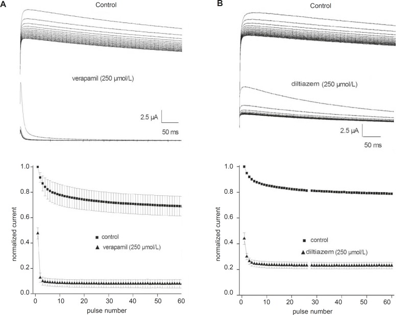 Figure 3. Use-dependent block of fKv1.4ΔN currents by verapamil (A) and diltiazem (B). Upper panels: Sixty repetitive depolarizing pulses from –90 to +50 mV for 500 ms each were applied in the absence and in the presence of verapamil (A) and diltiazem (B). Lower panels: Each peak current was normalized to the peak current at the first pulse under control conditions and then plotted against the number of pulses. Data are shown as mean ± SEM (n = 5).